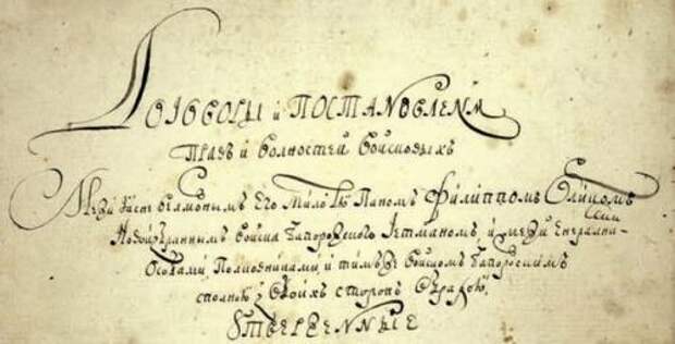 «Договоры и постановленья прав и волностей войсковых межи ясневелможным его милостю паном Филиппом Орликом, новоизбранным Войска Запорожского гетманом, и межи енералними особами, полковниками и тим же Войском Запороским сполною з обоих сторон обрадою утверженные и при волной елекции формалною присягою от того ж ясневелможного гетмана потверженные».