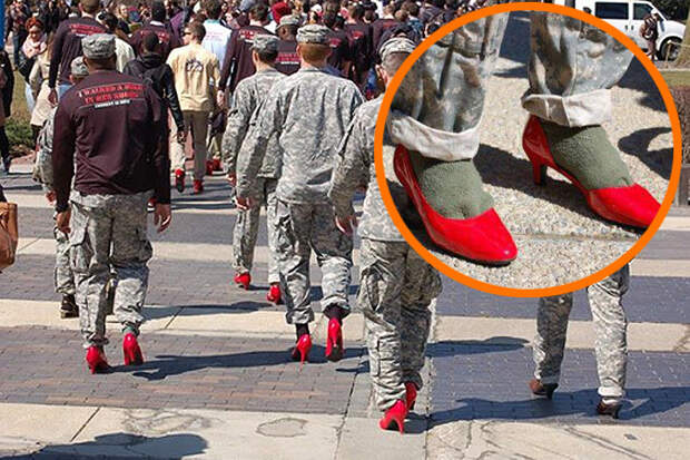 В этом колледже наравне с офицерами запаса, проходят программу обучения по химической, биологической, радиологической и ядерной защиты весь офицерский состав Вооруженных Сил США.Что же заставило бравых вояк (на снимки попали именно морские котики), которые держат в страхе мирное население Афганистана и Ирака, сменить свои удобные ботинки на женские туфельки? Оказывается, ежегодно по выходным в апреле и мае американские феминистки под любыми предлогами заставляют своих мужчин пройти в своих старых туфлях одну милю по городу. Во время акций они собирают пожертвования для пострадавших от мужского насилия.